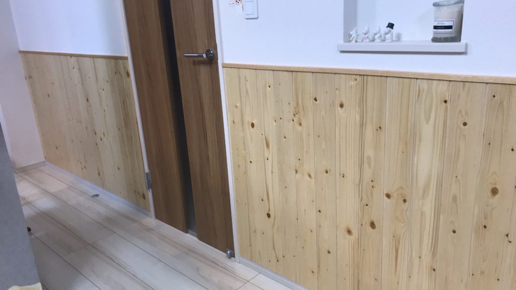 腰壁にも様々な種類があります。一番簡単な施工は、今回のような羽目板を一枚一枚貼っていくかキッチンのパネルを貼っていく施工です。 羽目板を貼り、見切りを付けただけでここまで見栄えが変わります。なにより、もう壁紙が汚れることも傷つくこともない...