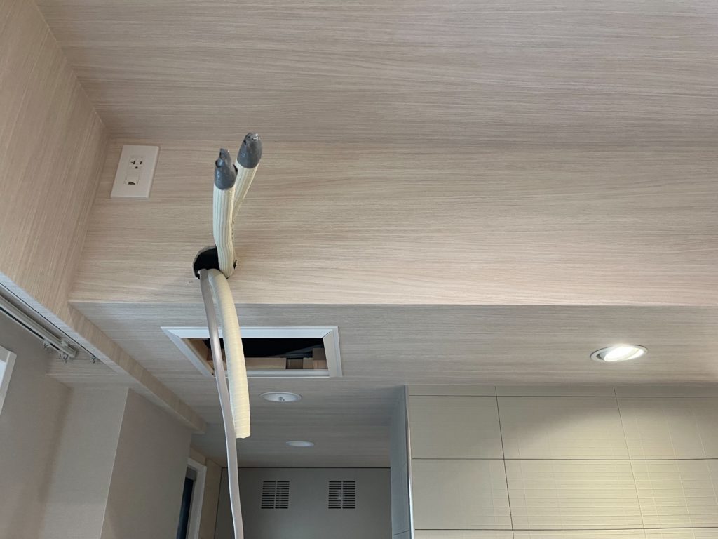 写真②は、室内機を設置する前の状態で、天井内から出ている冷媒配管とドレンホースの様子です。この工程が隠ぺい配管工事の最も重要なポイントの一つです。