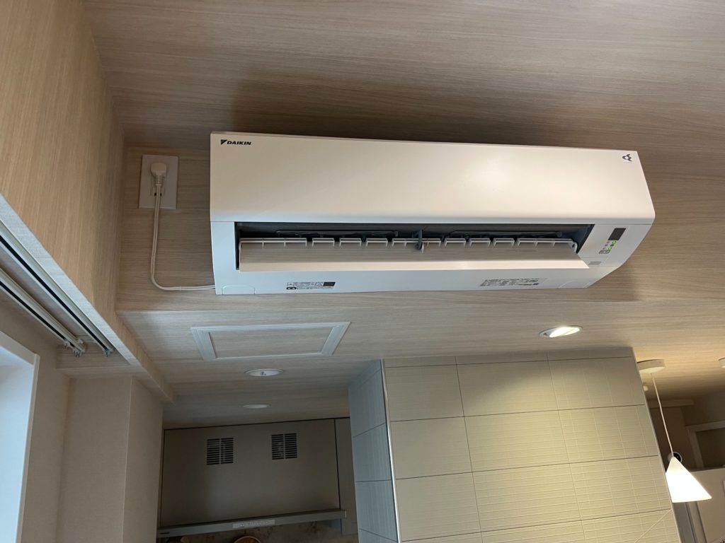 まずは完成した状態をご覧ください。ダイキン製の室内機が、天井近くの限られたスペースに美しく設置されています。隠ぺい配管の最大のメリットである「配管が一切見えないスッキリとした仕上がり」を実現できました。