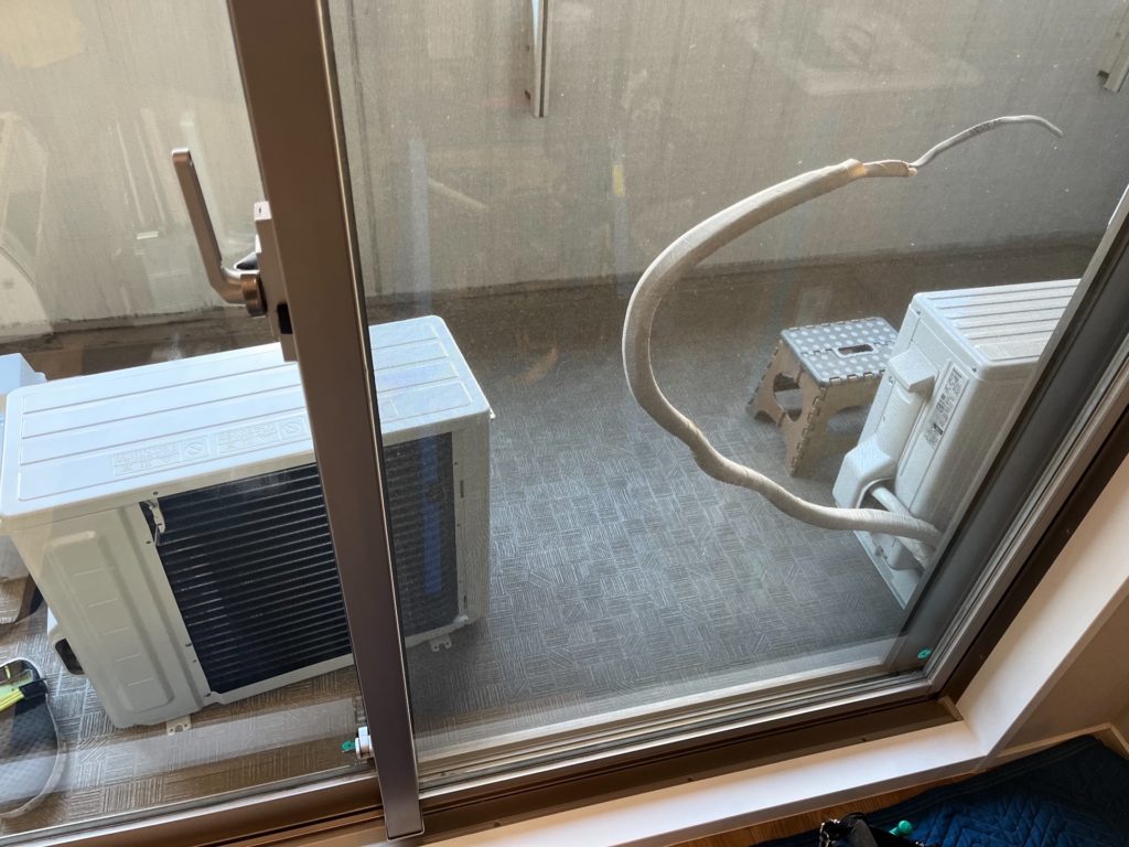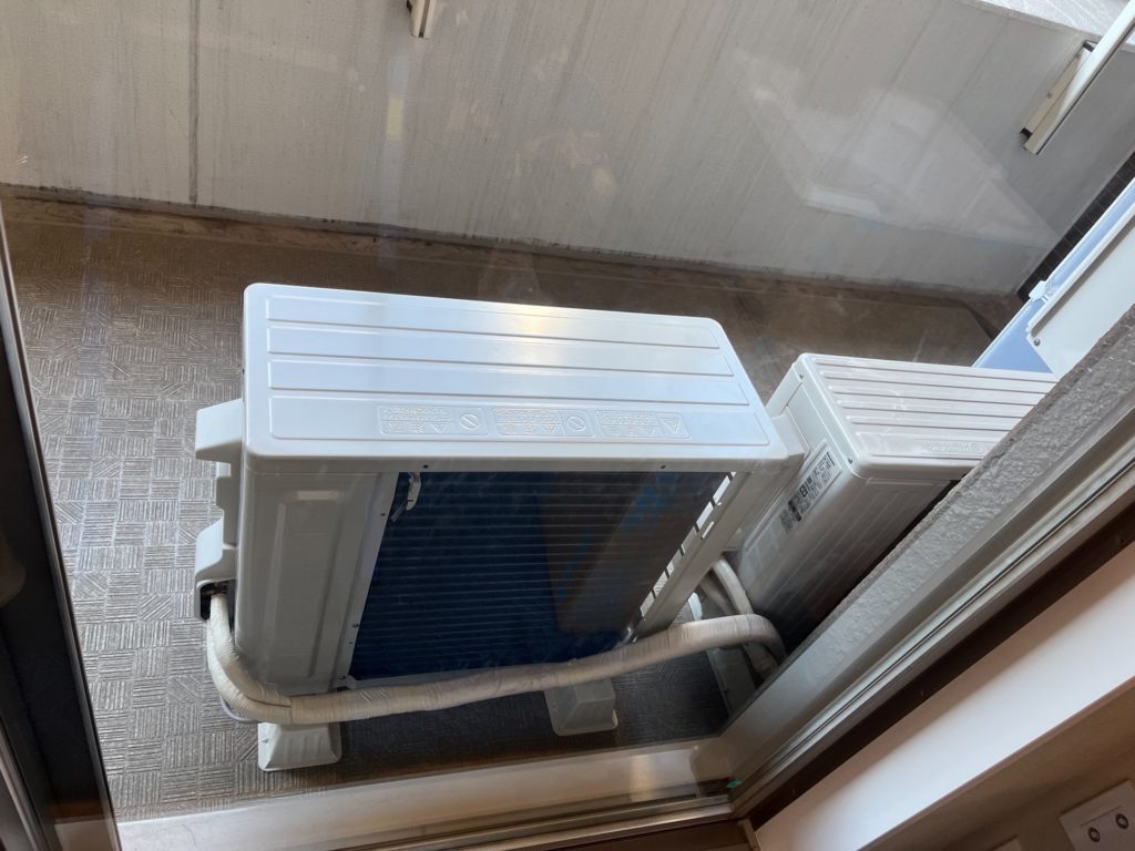 写真③は、ベランダに設置された室外機の様子です。既存の室外機と並んで設置されており、限られたスペースを有効活用した配置となっています。